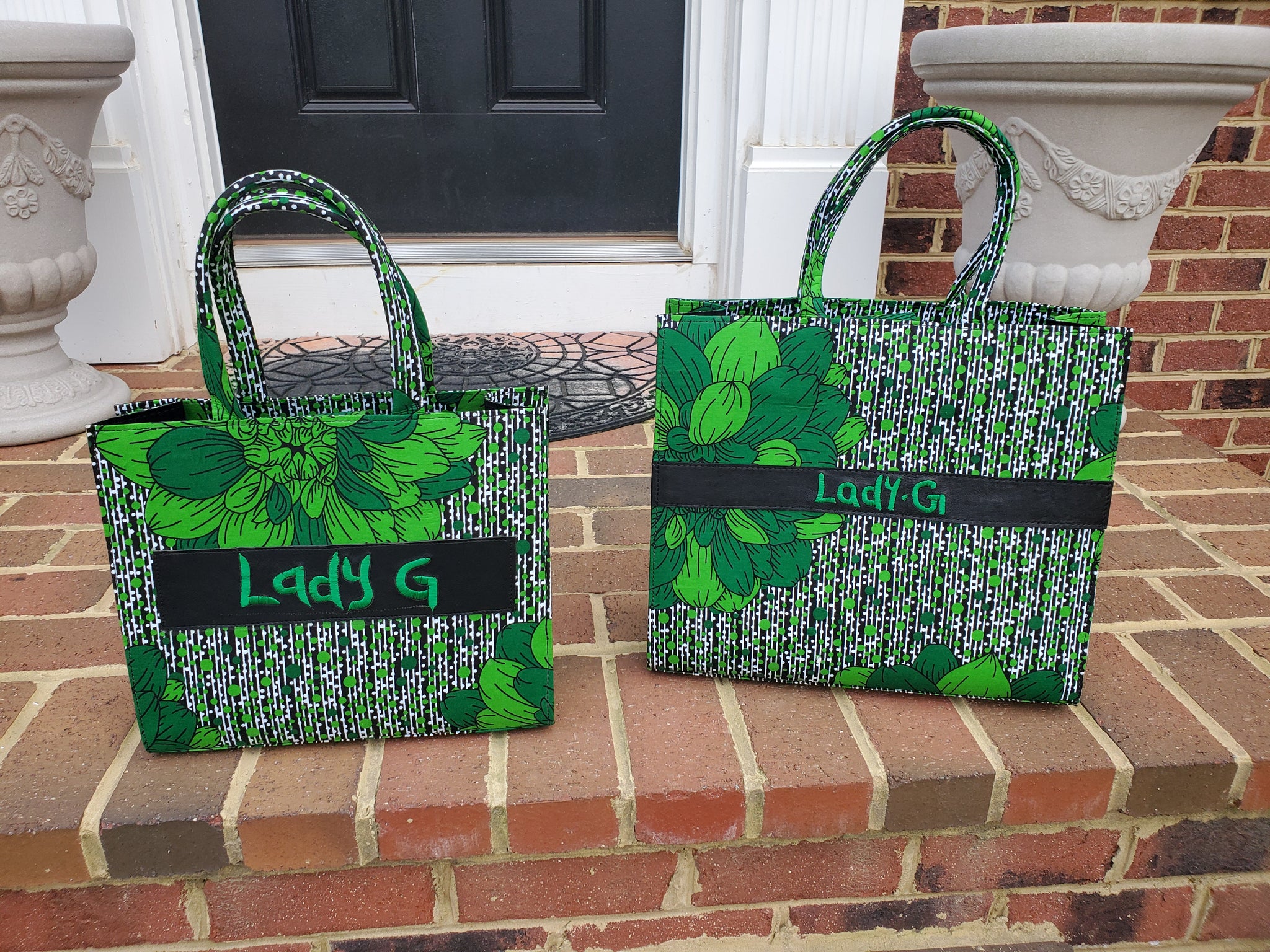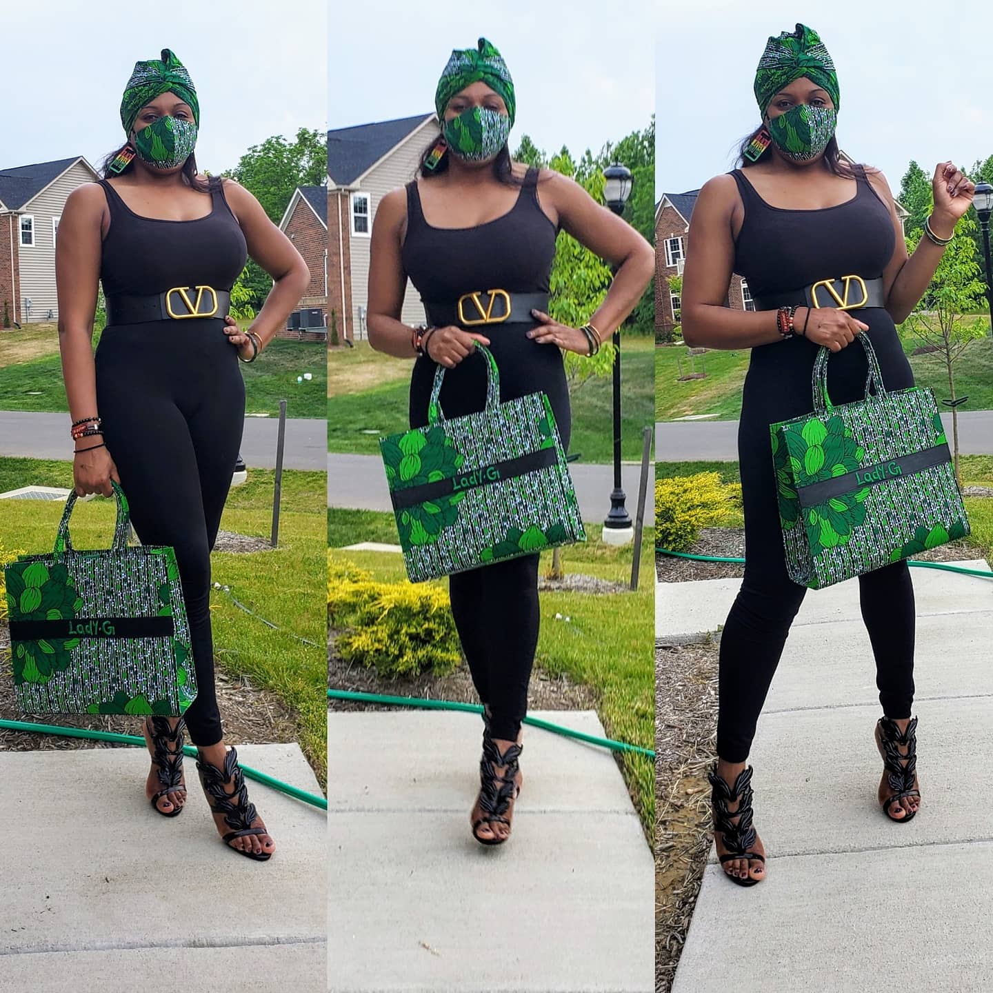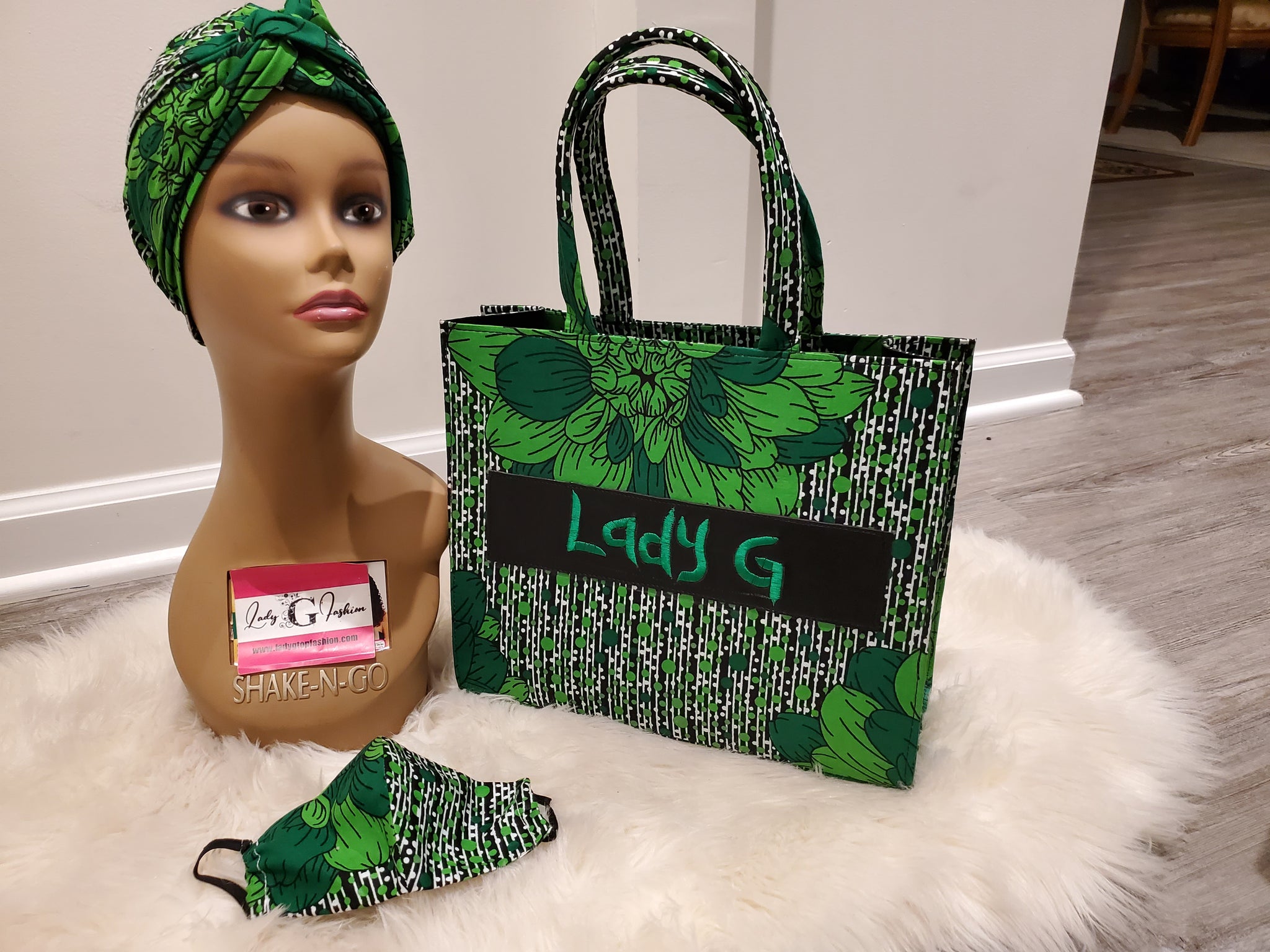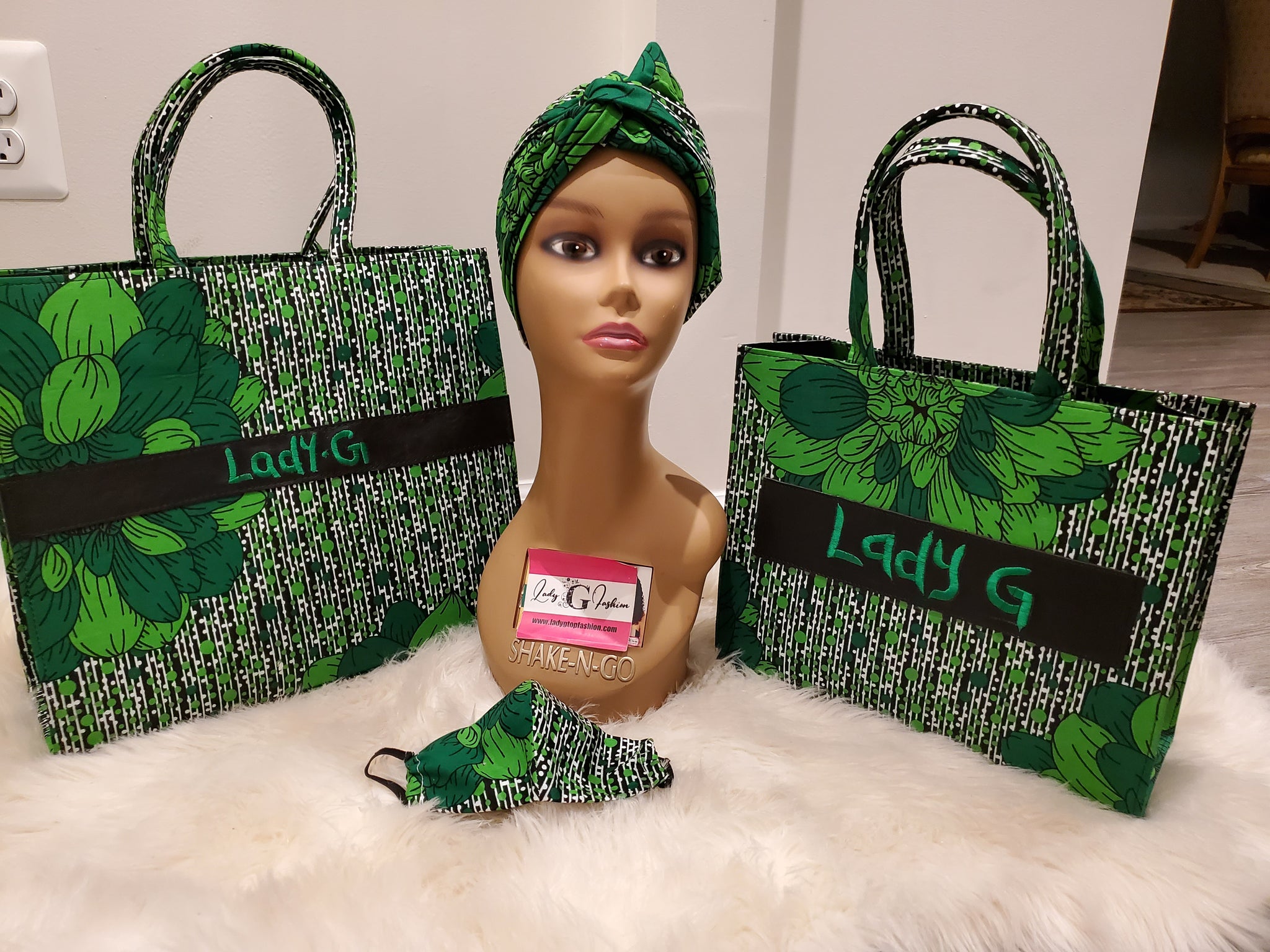 These are custom made handbags made with ankara material of your choice, with facemask and a turban. Also you can put a LOGO of your choice. Please allow 2 weeks processing before delivery.